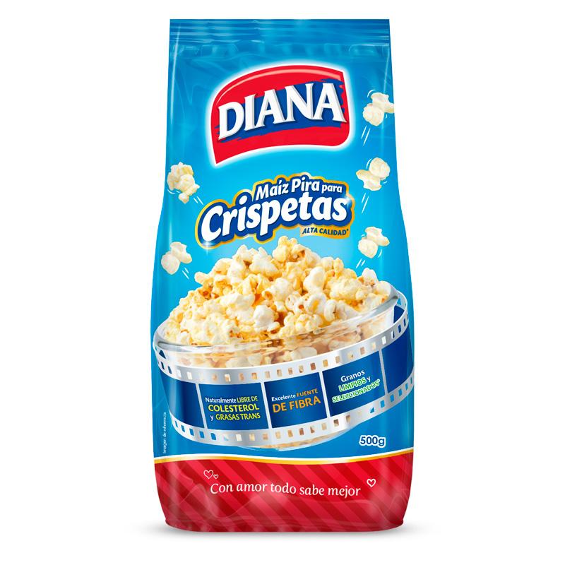 Maíz Pira para Crispetas alta calidad, granos limpios y seleccionados, es naturalmente libre de colesterol y grasas trans, excelente fuente de fibra. Presentación 500g