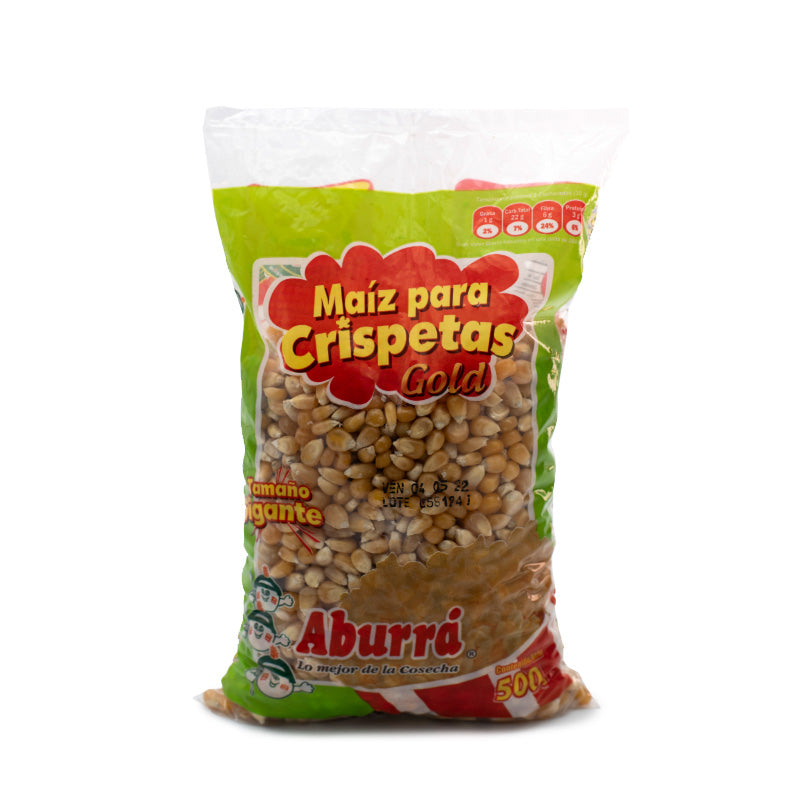 Maíz pira Aburrá.Maíz tipo americano para crispetas con un tamaño mucho más grande.Contenido neto 500g.