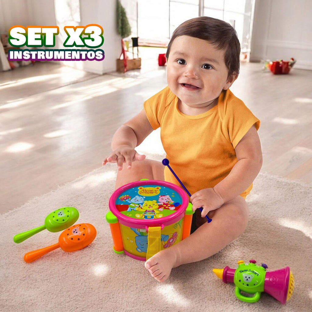 Hermoso kit musical para bebés, cuenta con 3 instrumentos musicales que atraerán al bebé y llamará su atención el sonido que generan los instrumentos.