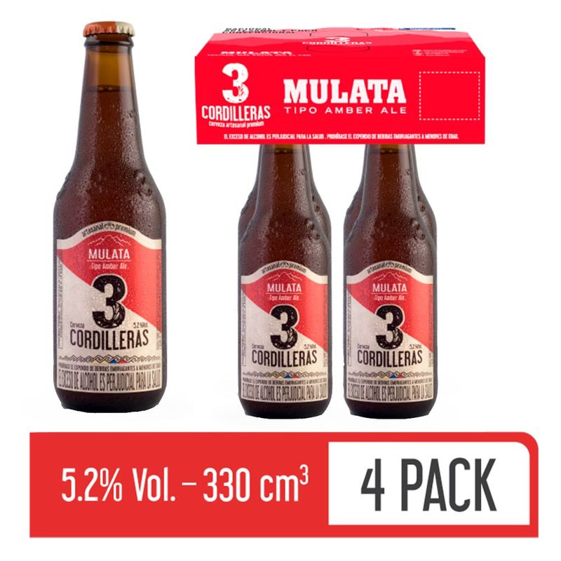 Cerveza 3 Cordilleras mulata botella 330ml x4. El exceso de alcohol es perjudicial para la salud. Ley 30 de 1986. Prohíbase el expendio de bebidas embriagantes a menores de edad ley 124 1994.
