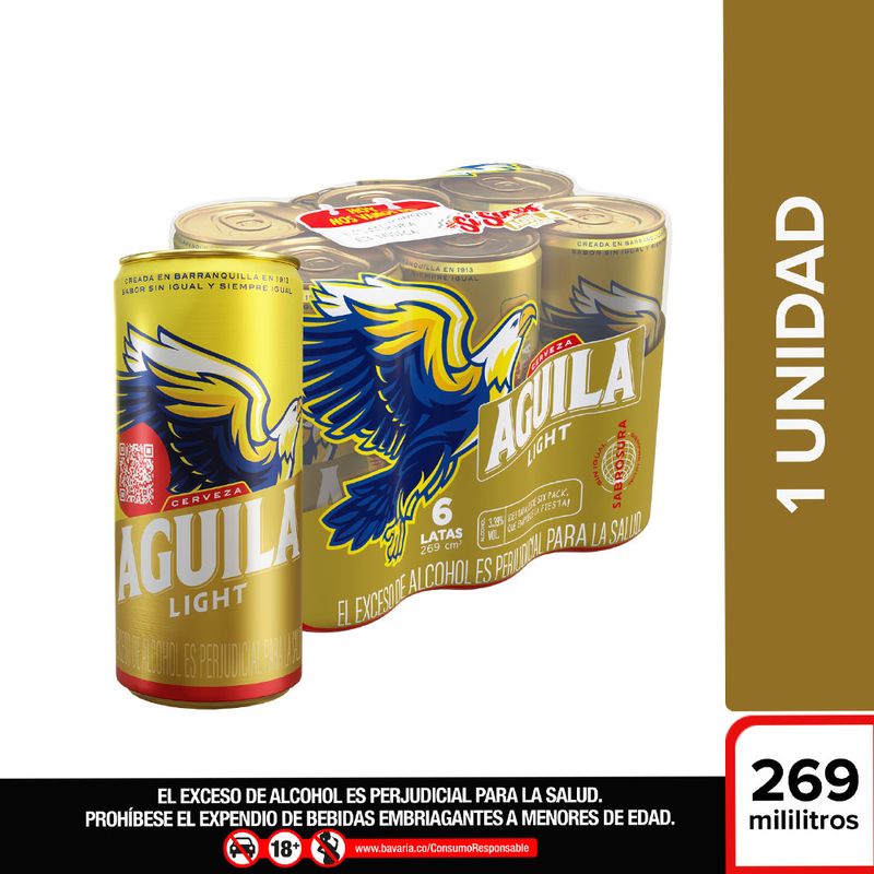 Cerveza Aguila light lata x6und x269ml c-u. El exceso de alcohol es perjudicial para la salud. Ley 30 de 1986. Prohíbase el expendio de bebidas embriagantes a menores de edad ley 124 1994.
