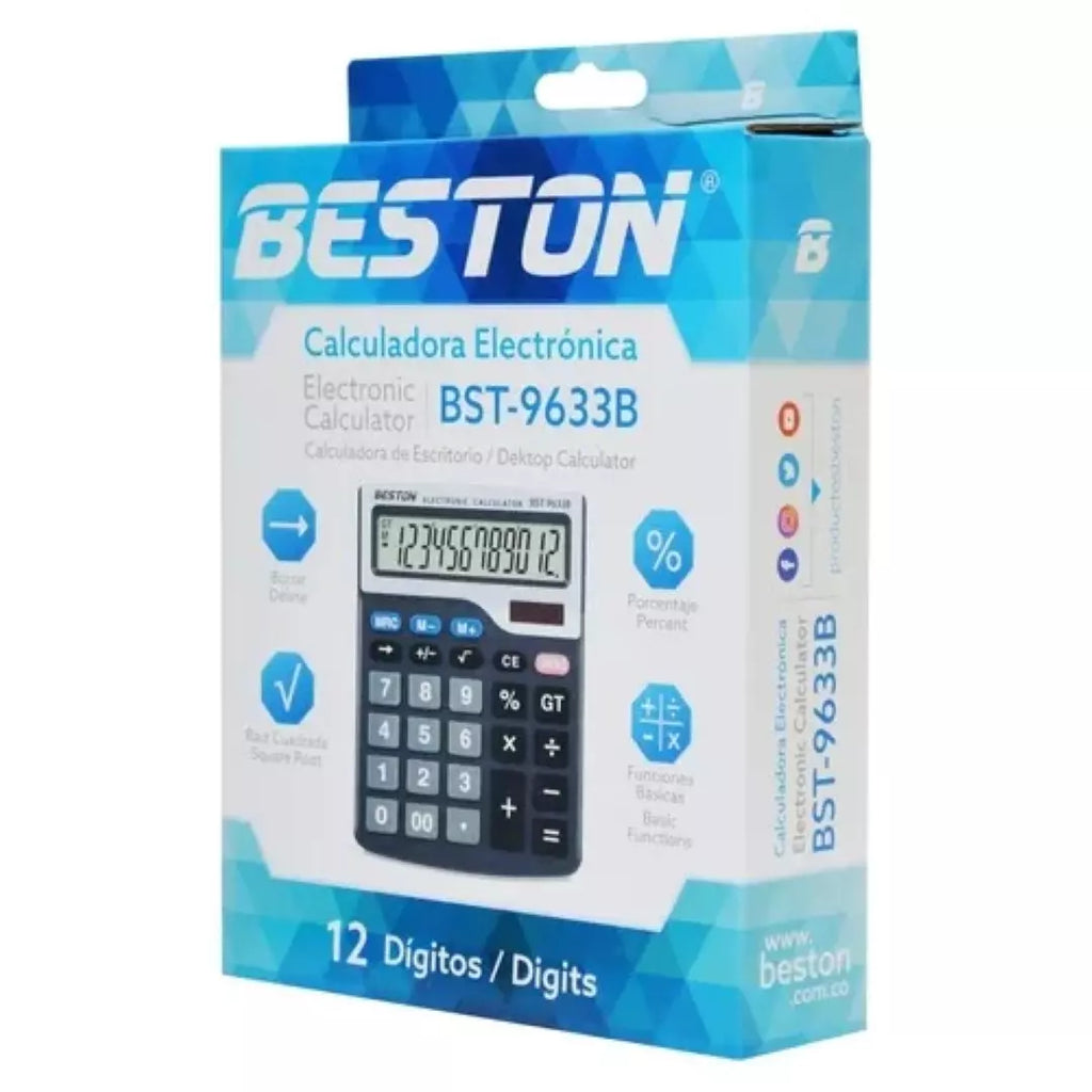 • Calculadora electrónica marca Beston de 12 dígitos.• Goza de una gran pantalla.• Realiza funciones básicas como: porcentajes, raíz cuadrada, borrar y apagado auto...