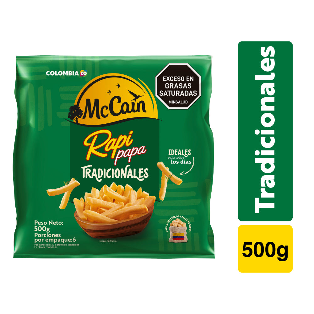 RapiPapa Tradicional - McCain - Crocantes por fuera y esponjosas por dentro. Papa precocida, prefrída y congelada. Contenido Neto 500 g.