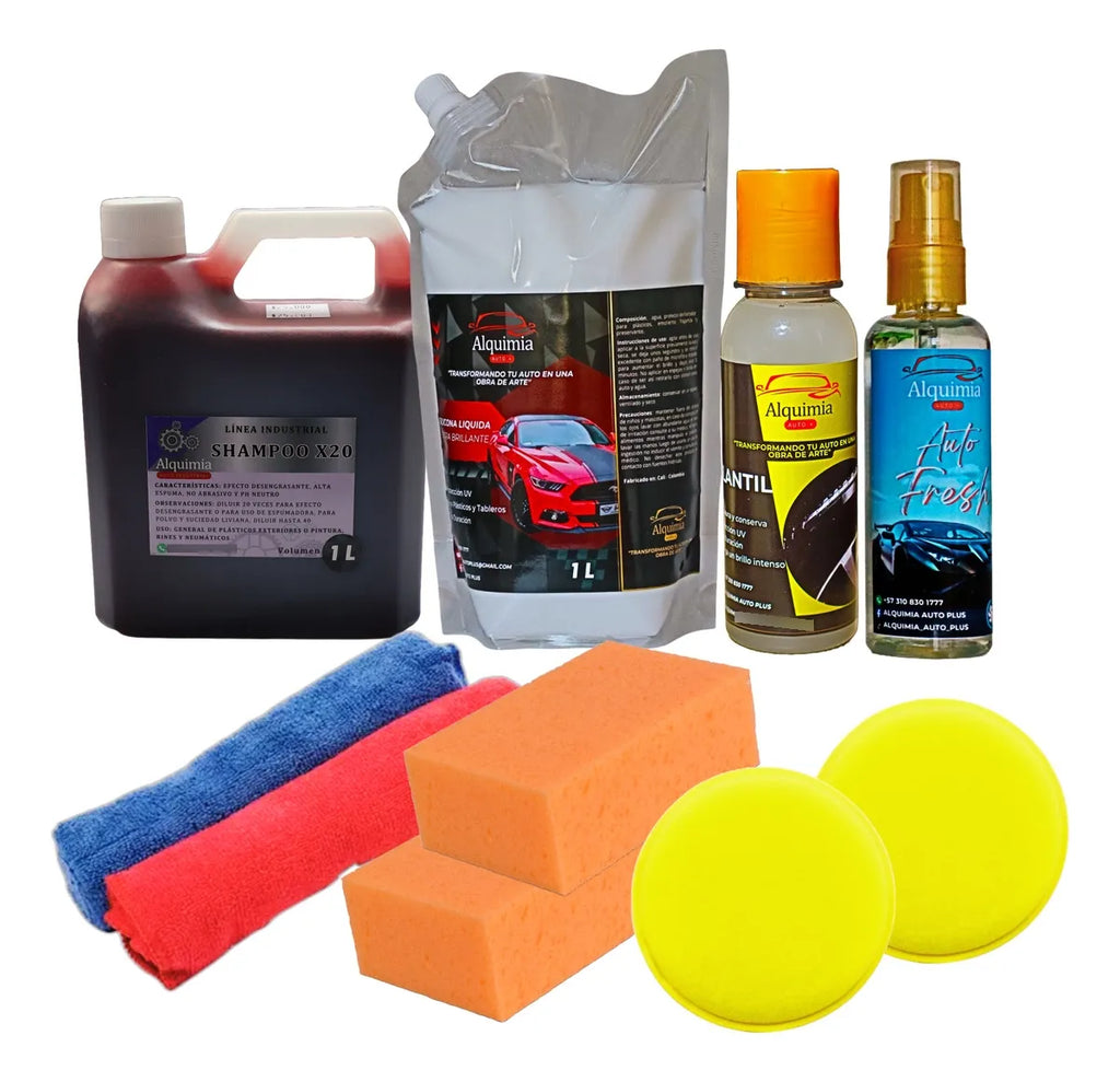 1 Litro Shampoo x20 + 1 Litro silicona + 120 mL llantil + 60 mL ambientador