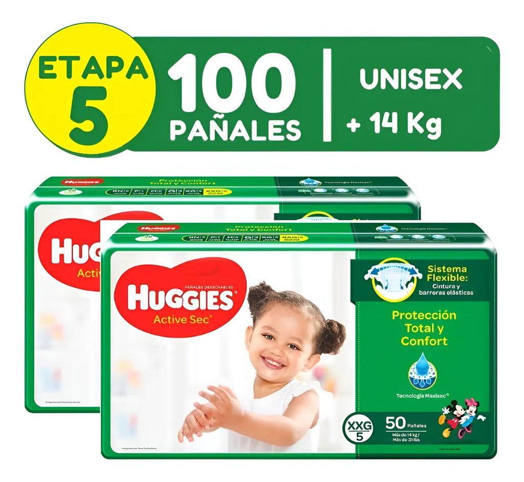Recibes 100 PAÑALES HUGGIES ACTIVE SEC ETP5 XXG 50 UDS, Registro Sanitario NSOA00170-09CO + Despacho inmediato