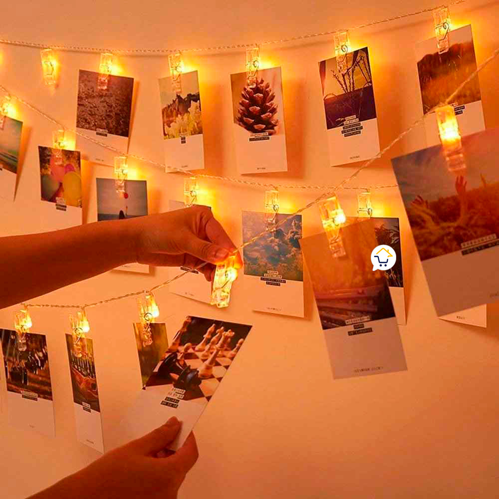 Cantidad de ganchos: 50 Luz disponible en color amarillo (luz calida) 110V / 3W Peso producto: 127 g. Cada clip fotográfico esta hecho de madera en color claro. Ilumin...
