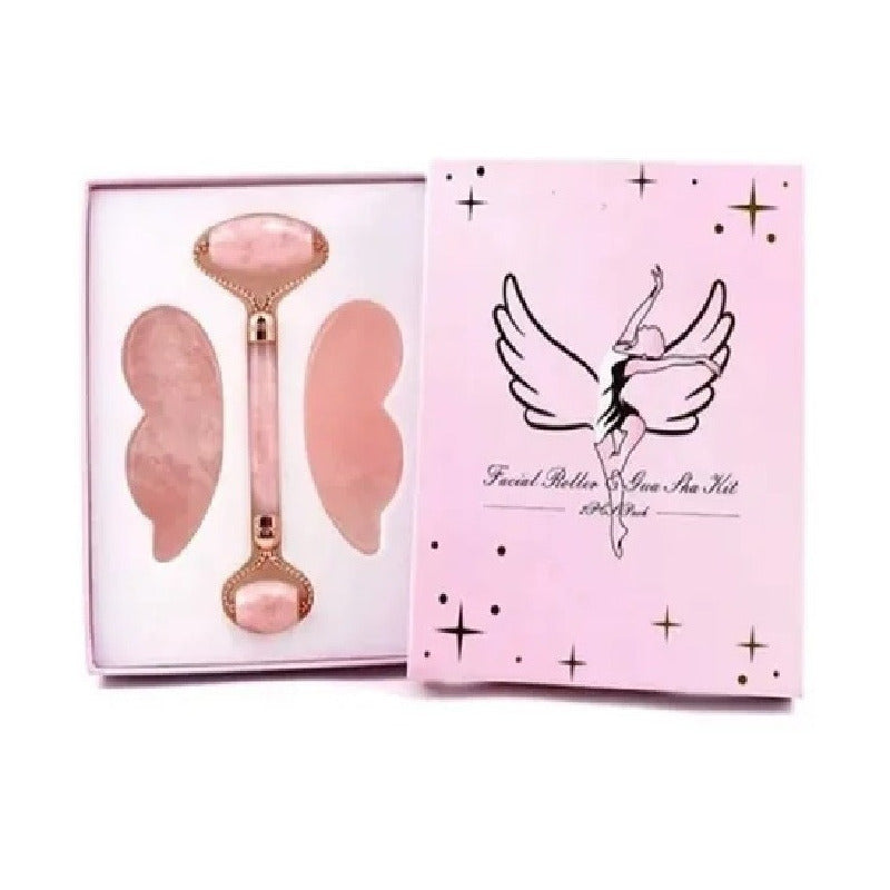 Rodillo masajeador facial + pala Gua sha cuarzo rosa