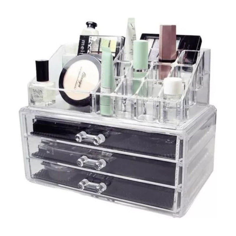 Este organizador de maquillaje cuenta con 16 compartimientos y 3 cajones, ideal para mantener todos tus cosméticos en orden.
