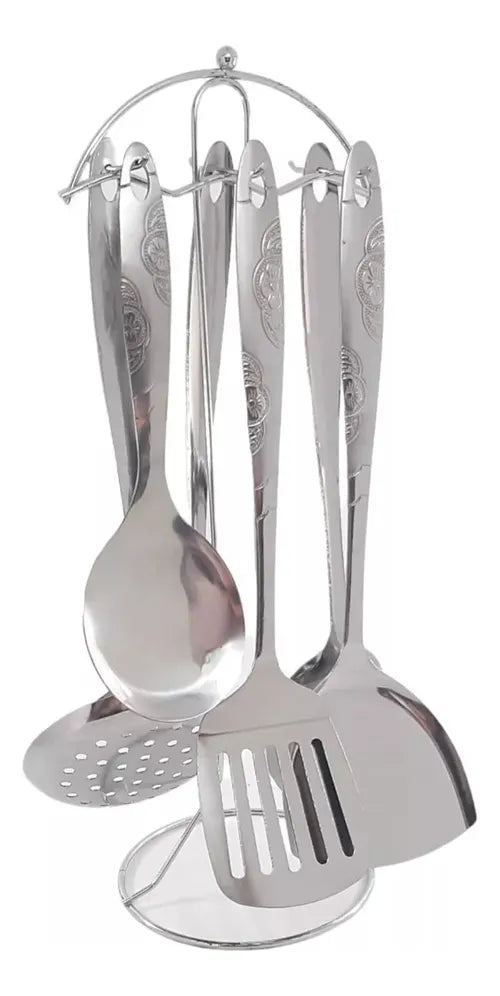 "Set de utensilios para cocina en acero inoxidable con soporte.