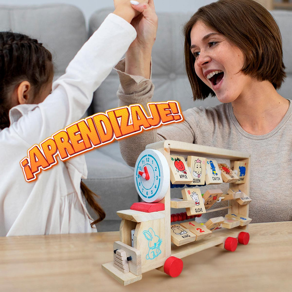 Un juego educativo completo para que los niños aprendan mientras se divierten. Este tablero de madera combina múltiples herramientas de aprendizaje en un diseño compacto y colorido.