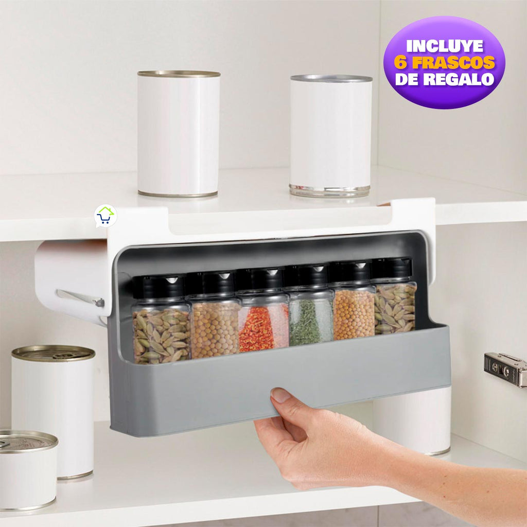 Hermoso organizador de condimentos con 6 recipientes para preparar las más deliciosas recetas que más le gustan a tu familia. Material: Plástico. Tamaño Aprox. Producto: Soporte: 9 x 32 x 13,5 cm / Frascos: 10 x 4,5 x 4,5 cm...
