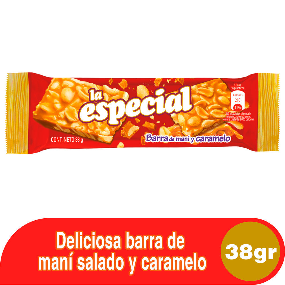 Barra La Especial maní caramelo, es ideal para los días en que tengas un antojito, esta deliciosa barra te brindará la energía necesaria hasta tu próxima comida. Contenido Neto 38 g.