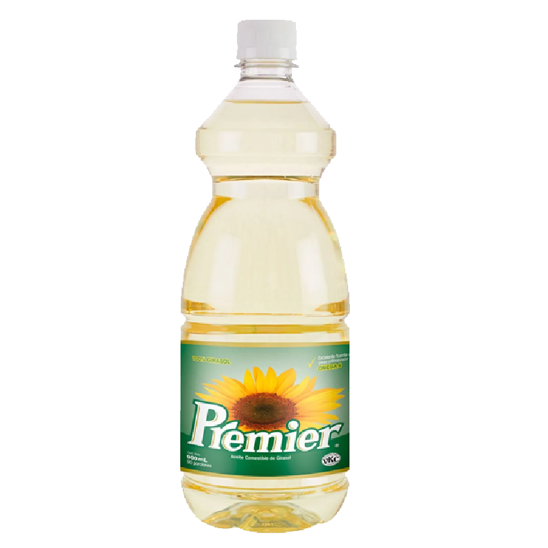 Aceite Premier de Girasol Contiene Omega 6 y 9. Naturalmente libre de grasas trans y colesterol. No altera el sabor, olor y color de los alimentos. Ideal para el uso en la cocina. Presentación 500C.