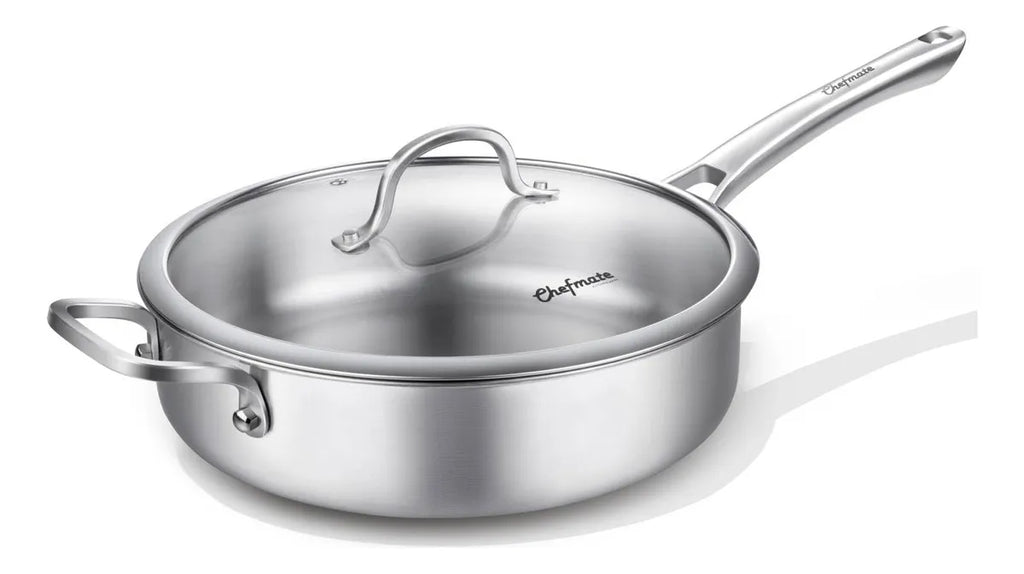 Chefmate Sartén para saltear de 5 cuartos de galón, utensilios de cocina de acero inoxidable, sartén de acero inoxidable, sartenes de acero inoxidable de 12 pulgadas con tapa, aptas para lavavajillas