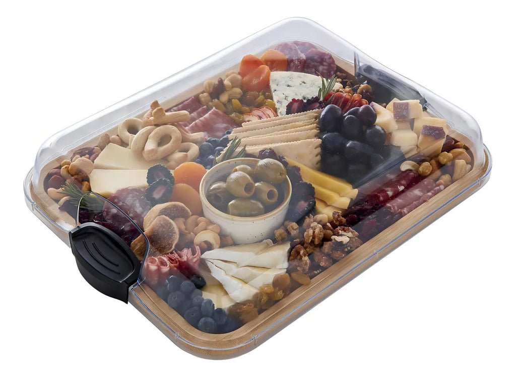 FARBERWARE Build-A-Board Tabla de cortar de bambú con tapa de bloqueo transparente y asas negras, perfecta para embutidos, aperitivos y más, compartimento único