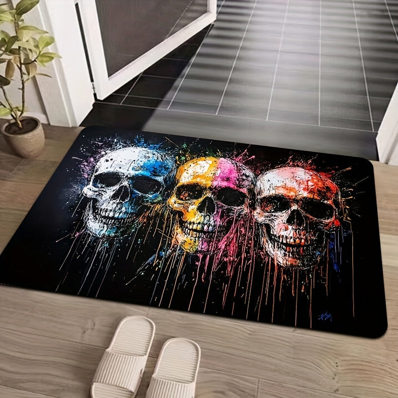 Alfombra de Entrada de Diseño de Cráneo Artístico - Lavable en Máquina, Rectangular, de Poliéster con Revestimiento de PVC, Alfombra Antideslizante para Entrada, Sala de Estar, Dormitorio, Cocina - Alfombra Decorativa de Suelo Hecha a Máquina