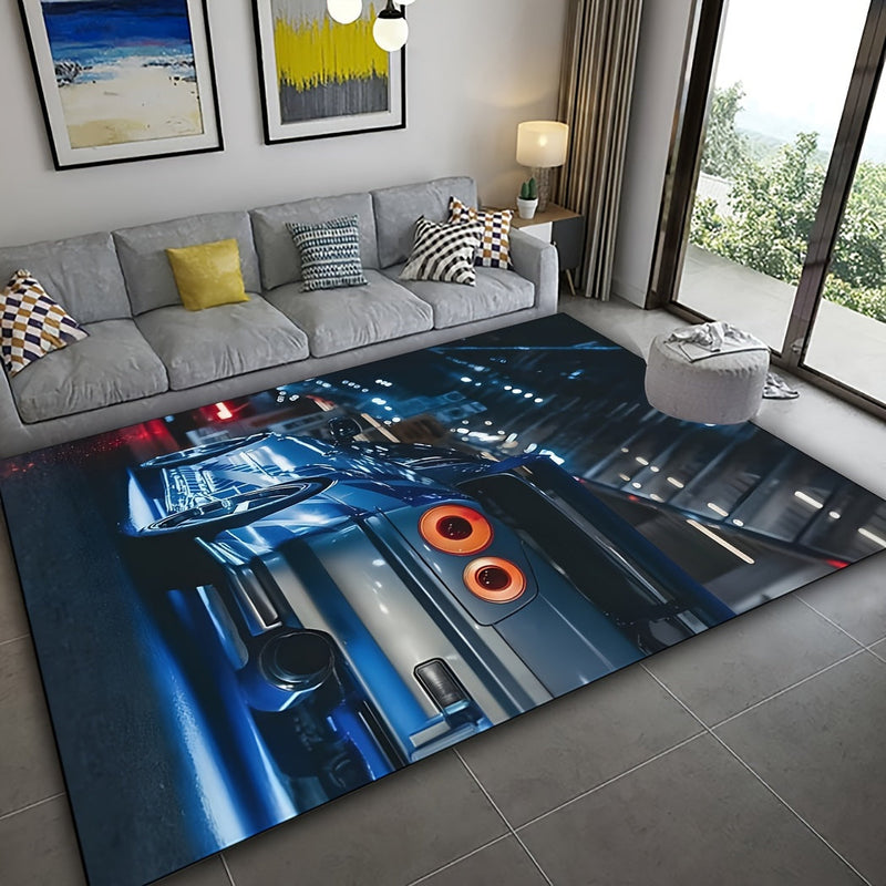 Alfombra de Área de Coche Deportivo Azul Lujosa - Antideslizante, Lavable a Máquina, Poliéster, Perfecta para Sala de Estar, Dormitorio, Bar y Habitaciones Juveniles - Disponible en 19x31/31x47/47x62/62x90 Pulgadas