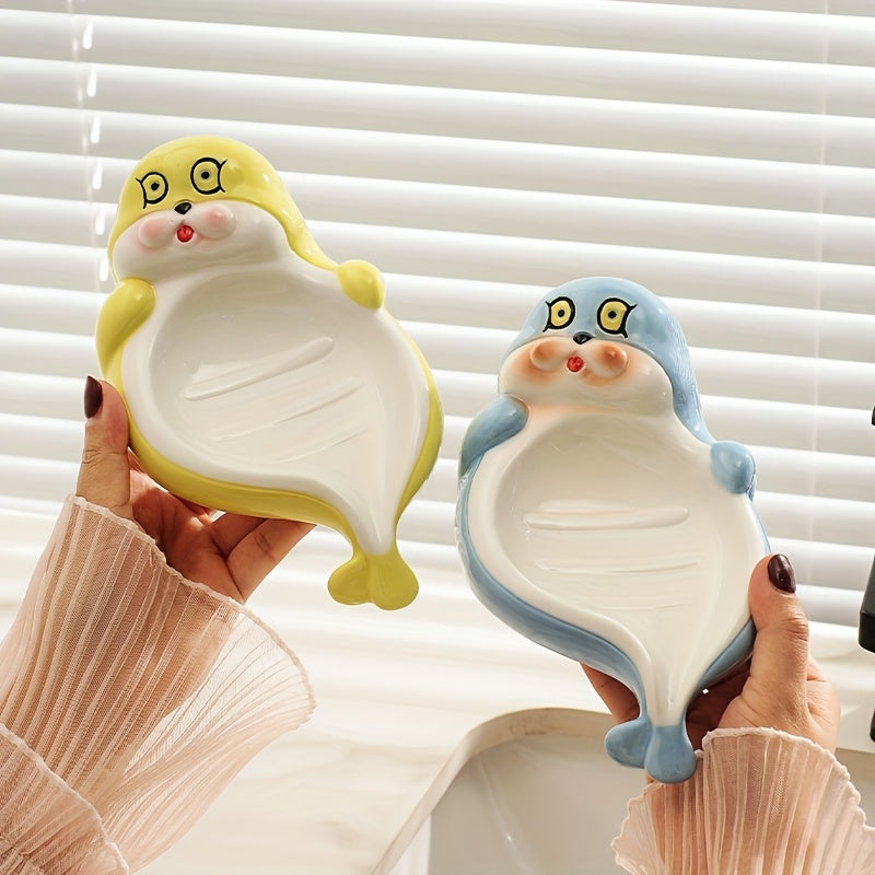 Caja de Jabón con Diseño de Foca de Dibujos Animados (1 pieza) - Soporte para Jabón Cerámico con Desagüe, Diseño Rectangular Lindo para Baño o Encimera del Inodoro, Estantes Creativos para Uso Doméstico