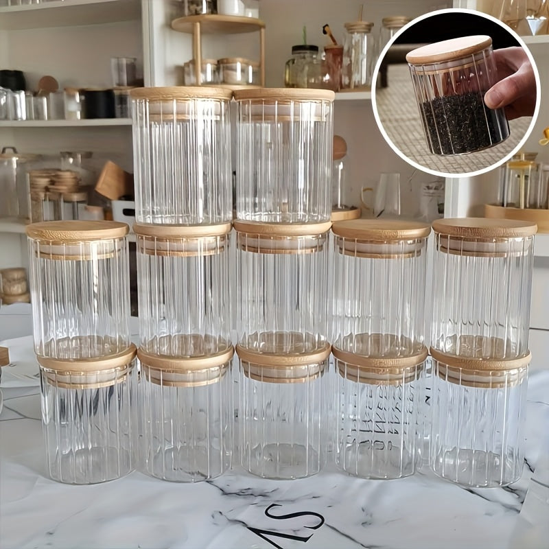 4/6/12 piezas de jarra de vidrio para café y nueces, jarra de almacenamiento sellada, recipiente de vidrio transparente con tapa de bambú y asa de metal para almacenamiento en el hogar, cocina, dulces, galletas, pasta, avena, especias (pequeño)