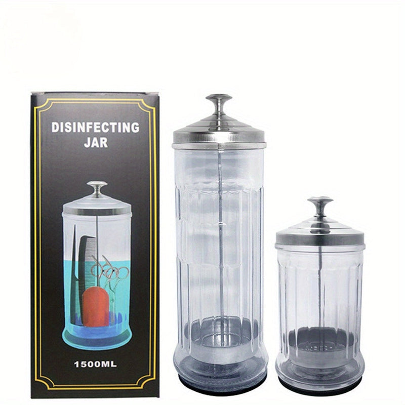 Jarrón de vidrio de acero inoxidable para desinfectar herramientas en salones de belleza y cuidado de uñas.