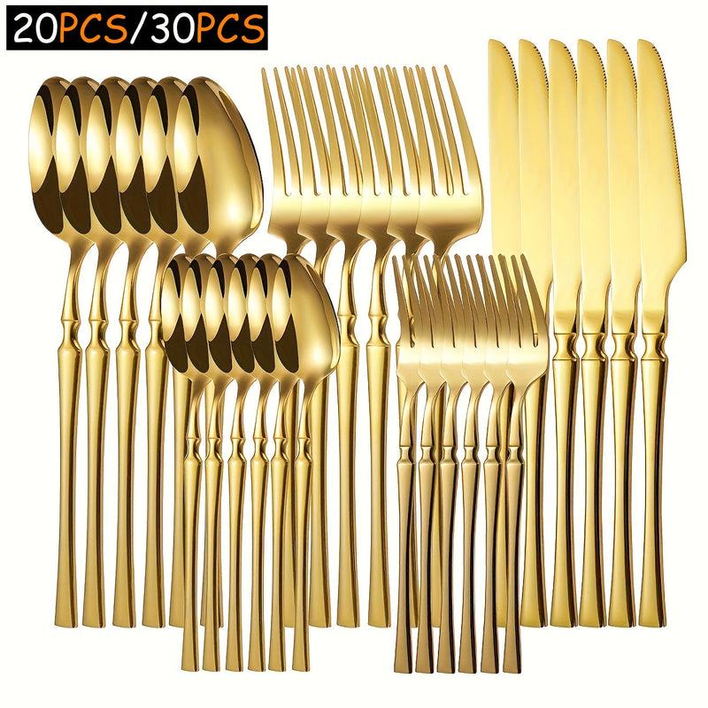 Juego de Vajilla de Acero Inoxidable para Cintura Pequeña de 20pcs/30pcs, Incluye Tenedores, Cucharas, Cucharas de Postre, Tenedores de Fruta y Cuchillos, Muy Adecuado para Cocina de Hogar, Restaurante, Hotel, Boda, Fiesta, Lavavajillas Dorado
