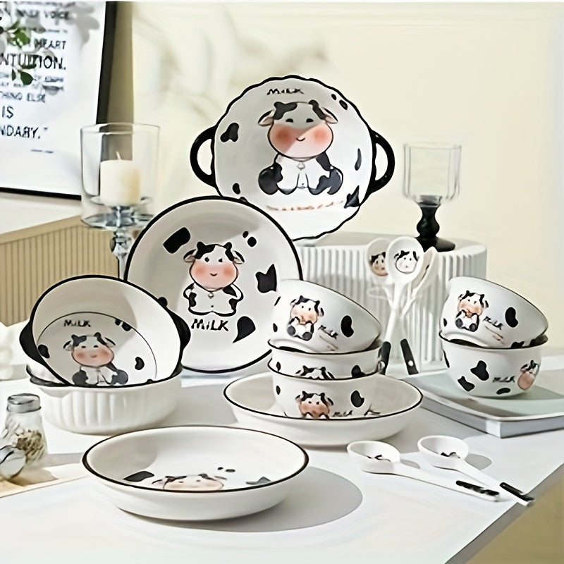 Juego de vajilla de cerámica moderna con lindo diseño de vaca de dibujos animados, platos y cuencos redondos con temática animal, adecuado para residencias universitarias y estudiantes universitarios - Juego de 3/4 piezas