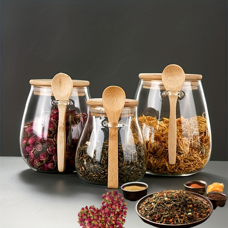 Juego de 3 recipientes de vidrio transparente para bocadillos, con tapa cuchara, herméticos, reutilizables, para cocina y despensa