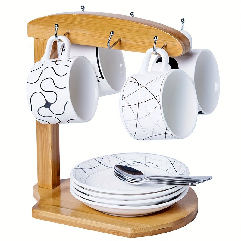 Elegante soporte de tazas y vasos de bambú con diseño floral - Organizador de cocina de madera elegante para tazas, platos y utensilios, organizadores y almacenamiento de cocina