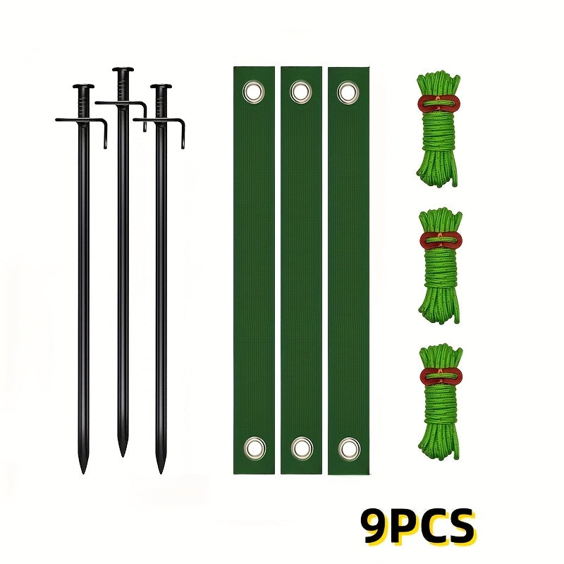 Juego de ataduras de soporte de tronco de árbol de alta resistencia verde, 9 piezas de clavos de tierra negros, adecuados para atar árboles de jardín al aire libre, reparaciones y salidas moldeadas, refuerzo de tienda de picnic