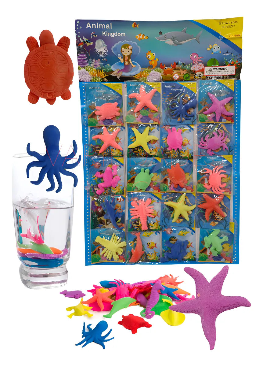 Colección Crecen En El Agua de Hobby que incluye 20 unidades de figuras de dinosaurios y animales del mar. Estas figuras, fabricadas en goma, son perfectas para estimular la imaginación de los más pequeños, permiti...
