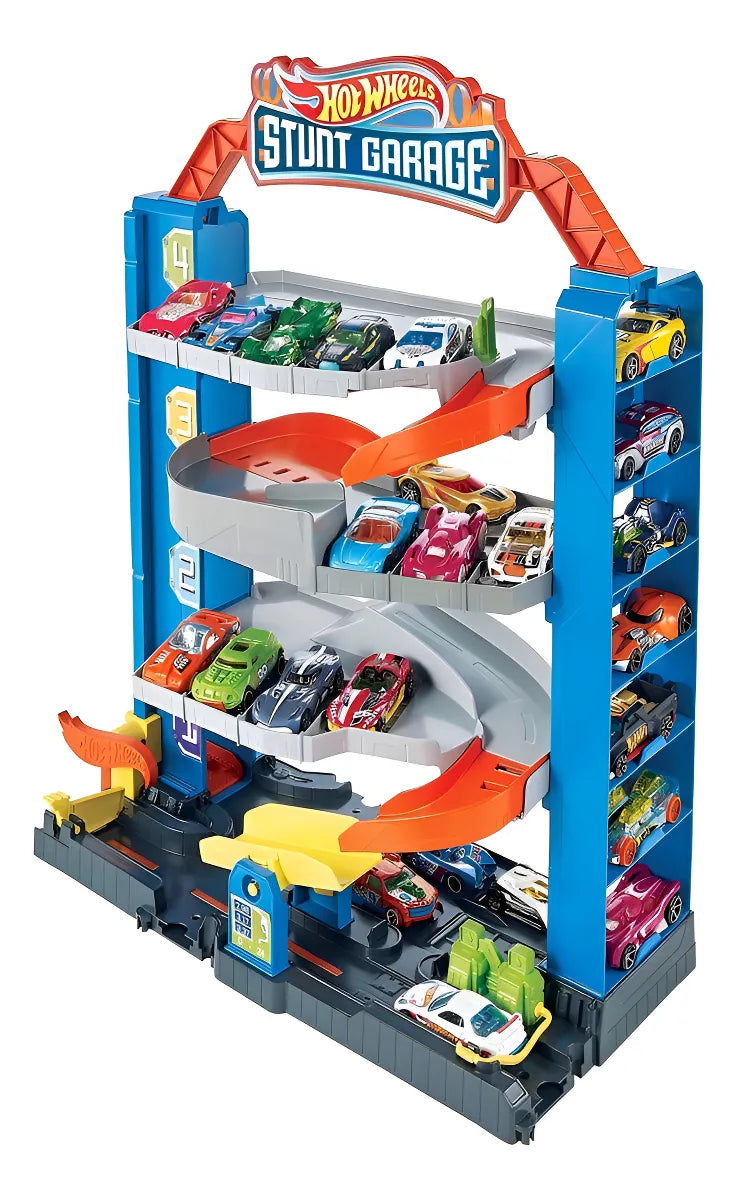 El Stunt Garage de Hot Wheels™ City es el garaje que permite a los vehículos saltar de un piso a otro. Cuenta con un ascensor para elevar los vehículos a cualquier nivel, donde se puede optar por estacionar o reali...