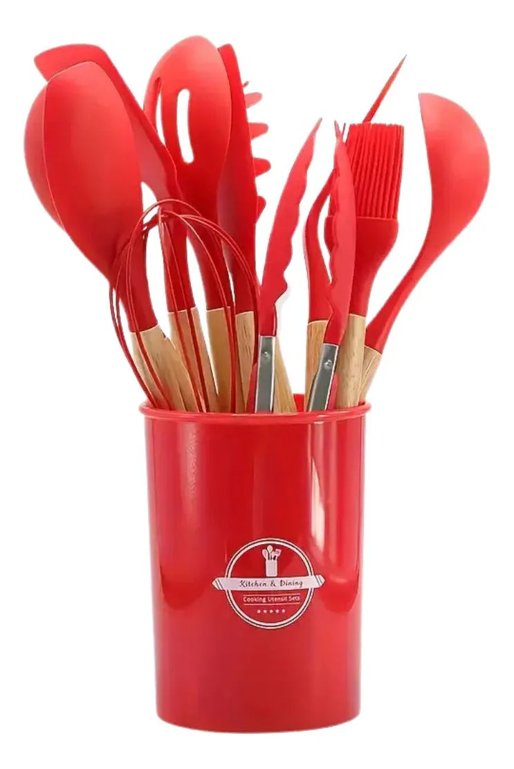 Set de 12 Utensilios de Cocina de Silicona con Mango de Madera Color Rojo - Chic Haus