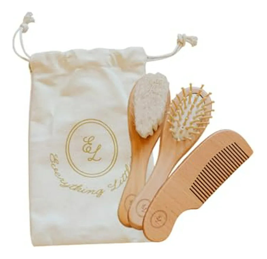 NOMBRE EN ESPAÑOL: Set de Cepillos de Madera para Bebé - 3 Piezas, Suaves y Seg
