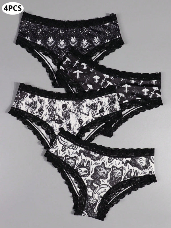 4 Piezas Bragas Goticas Con Contraste De Encaje, Impresion De Calaveras, Hongos Y Cabras Para Las Intimas De Halloween, Lenceria Y Ropa Interior Para Mujeres