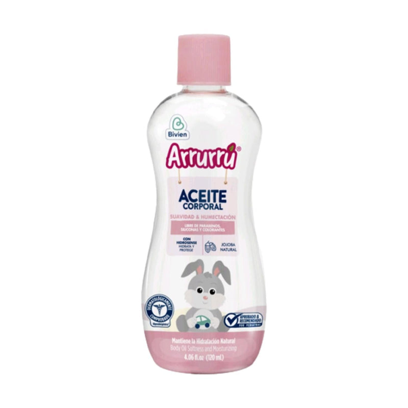 Aceite Arrurru original x 120 ML, contiene extractos 100% naturales que humectan y suavizan la piel de tu bebé, es un producto hipoalergénico. Con solo aplicar el producto en las manos y frotar suavemente en la piel del bebé, descubrirás una suave textura de algodón en todo su cuerpo.