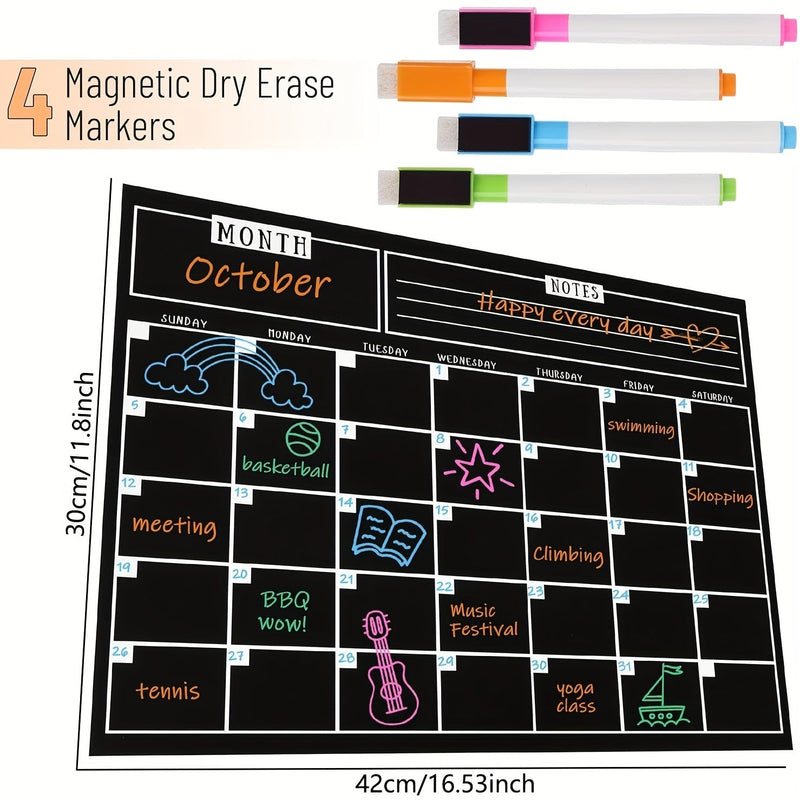 Calendario Magnético Negro Elegante y Eficiente para Nevera - 37.34 x 29.97cm Material PET, Planificador Mensual con Notas Semanales y 4 Marcadores Coloridos, Ideal para Organizar Actividades Familiares y Recordatorios