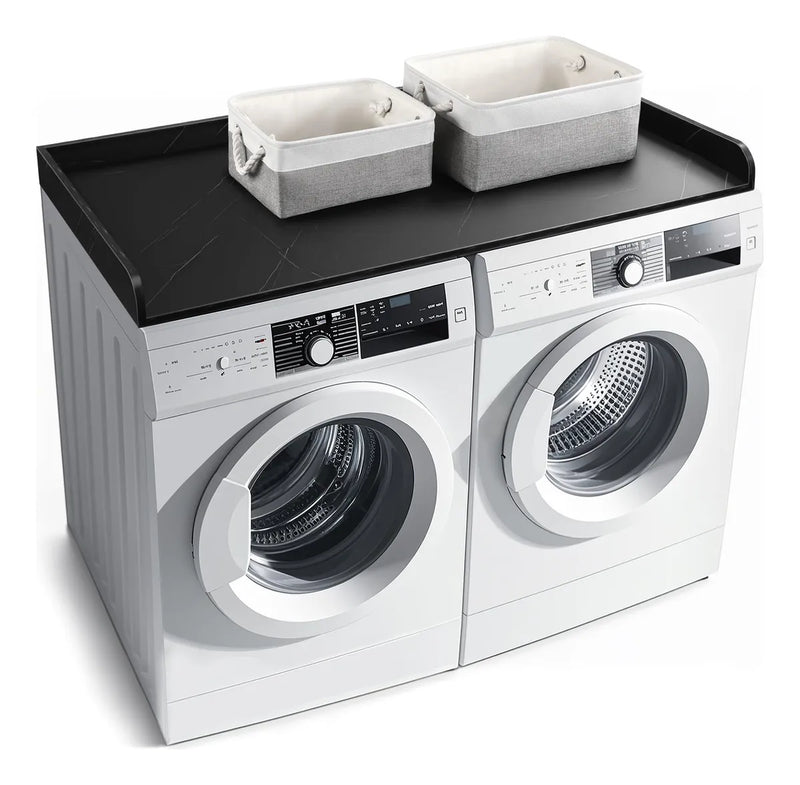 -Tamano y compatibilidad: con dimensiones de aproximadamente 27.5 pulgadas de ancho, 54 pulgadas de largo y 3 pulgadas de profundidad con rieles de borde, esta encimera esta disenada para integrarse perfectamente con la mayoria de las lavadoras. Proporciona un ajuste comodo para proteger la superficie superior de manera efectiva y tambien evitar detergentes para ropa, etc. de caerse. Se proporcionan dos cestas de almacenamiento adicionales para que almacenes ropa sucia o suministros de lavanderia.