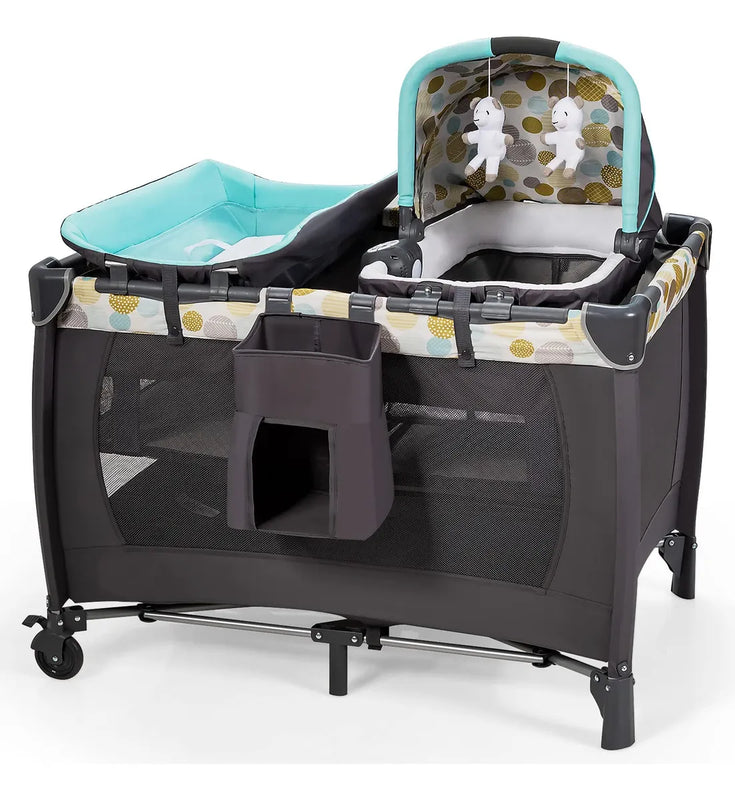 Cambiador de pañales y bolsa de almacenamiento lateral: viene con un cambiador de pañales y un práctico almacenamiento lateral, este centro de guardería te ayuda a cuidar a los recién nacidos o bebés sin problemas. Proporciona un lugar cómodo para que el recién nacido o bebé se limpie y el organizador de pañales puede mantener los pañales y otras necesidades a mano.