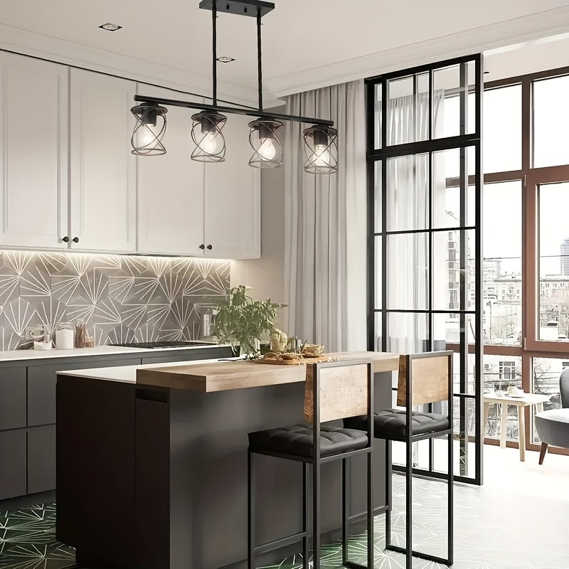 Iluminación de isla de cocina medieval moderna con poste ajustable y jaula metálica negra, adecuada para hoteles, salones, comedores y entradas de pasillos (bombillas no incluidas)