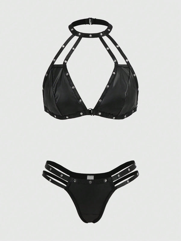 ROMWE Grunge Punk Conjunto De Ropa Interior De PU Con Cuello Halter Decorativo Con Cuentas