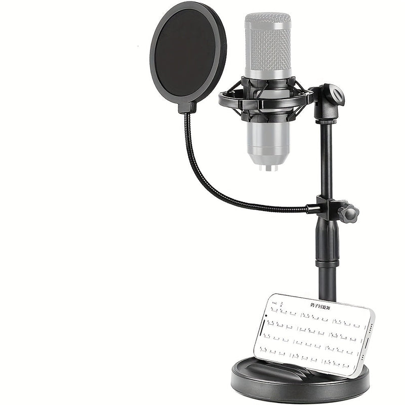 Soporte de micrófono de escritorio negro de ABS con soporte para teléfono, base pesada, filtro popular, amortiguador de choques, abrazadera de micrófono - Ideal para estudio de grabación en casa, configuración de grabación en casa | Soporte de micrófono