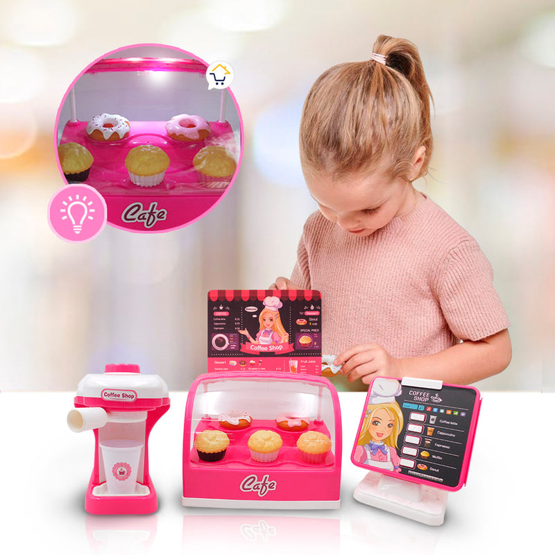 ¡Abre tu propia tienda de café y pastelería imaginaria! dale un vistazo al menú para decidir qué preparar y ten todo listo para compartir y divertirte con tus amigos con este juguete divertido que incluye luces y sonido para una experiencia más realista.