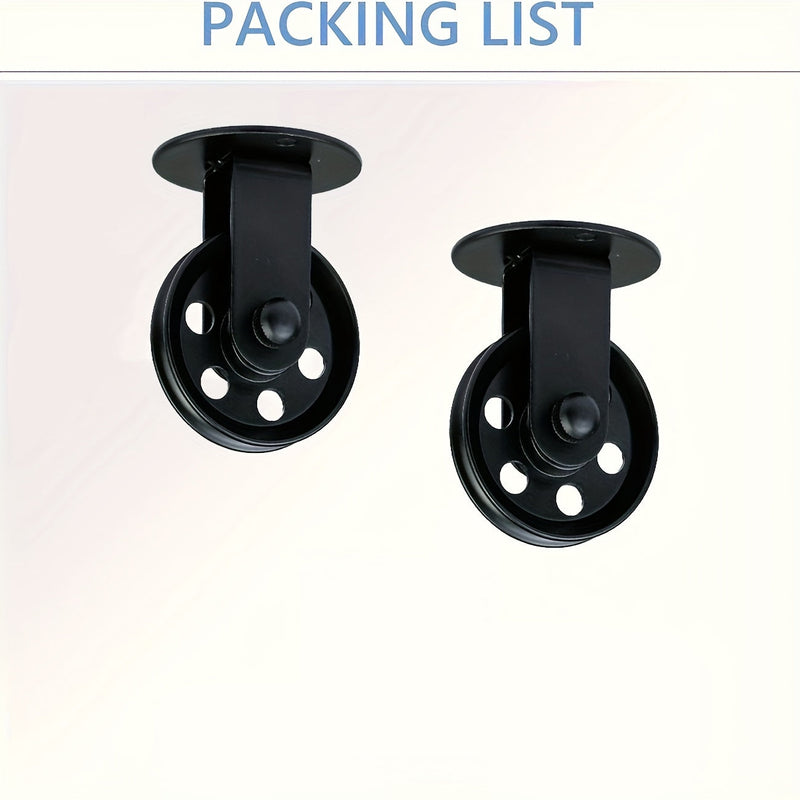 Un conjunto de 2 poleas negras de 2 pulgadas, 2 para luces de araña, diseñadas para poleas de pared vintage para luces de crecimiento de plantas en un gazebo industrial rústico.